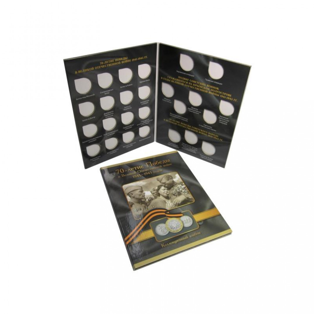 - Описание: Альбом-планшет под монеты России 2014 - 2015 гг. Номиналом 5 рублей: 18 монет серии - 70-летие Победы в Великой Отечественной Войне 1941-1945 гг. 5 монет серии - Подвиг советских воинов,сражавшихся на крымском полуострове в годы ВОВ 1941-1945гг. Номиналом 10 рублей: 3 монеты серии - 70-летие Победы советского народа в ВОВ 1941-1945 гг.