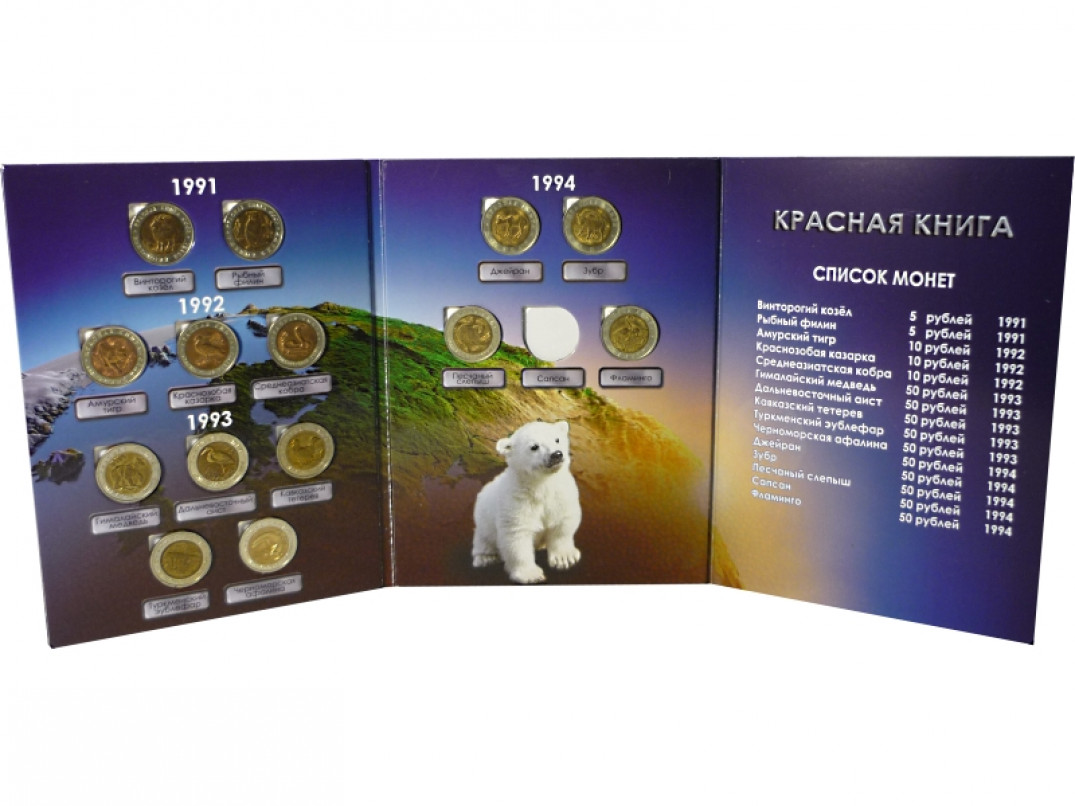 - Описание: Альбом-планшет для серии монет "Красная Книга" на 15 монет. В 1991 году выпущены первые две монеты серии - Винторогий козел и Рыбный филин, в 1992 вышло ещё 3 монеты - Амурский тигр, Краснозобая казарка, Среднеазиатская кобра. В последующие два года выпустили по 5 монет1993 - Гималайский медведь, Дальневосточный аист, Кавказский тетерев, Туркменский эублефар и Черноморская афалина, 1994 - Джейран, Зубр, Песчаный слепыш, Сапсан, Фламинго.Альбом-планшет произведен из ламинированного картона, ячейки выполнены в форме капли, каждая ячейка подписана, также на развороте расположен полный список монет серии с годами выпуска, номиналом монеты и интересная информация о каждом животном. В таком альбоме Ваша коллекция монет отлично сохранится и не займет много места..