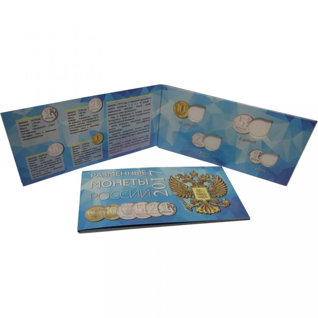 - Описание: Буклет под разменные монеты России 2017 года. Буклет для монет выполнен из ламинированного картона предназначен для небольших серий одной тематики. Размер ячейки соответствует размеру монеты, а каплевидная форма позволяет легко извлекать монеты из гнезда.