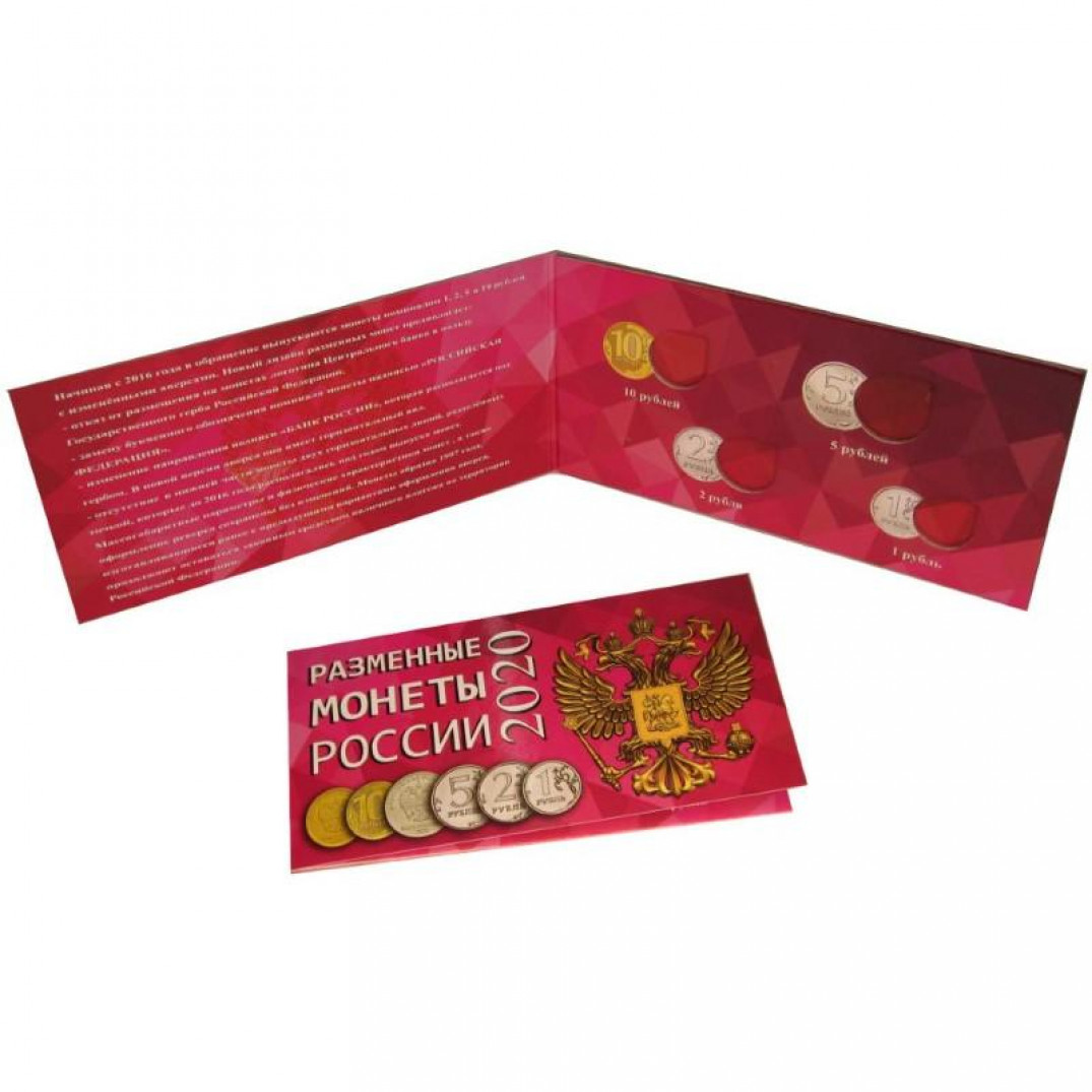 - Описание: Буклет для разменных монет России 2020 года: - 1 рубль - 2 рубля - 5 рублей - 10 рублей. Буклет для монет выполнен из ламинированного картона с использованием цветной печати, предназначен для небольших серий одной тематики. Размер ячейки соответствует размеру монеты, а каплевидная форма позволяет легко извлекать монеты из гнезда.