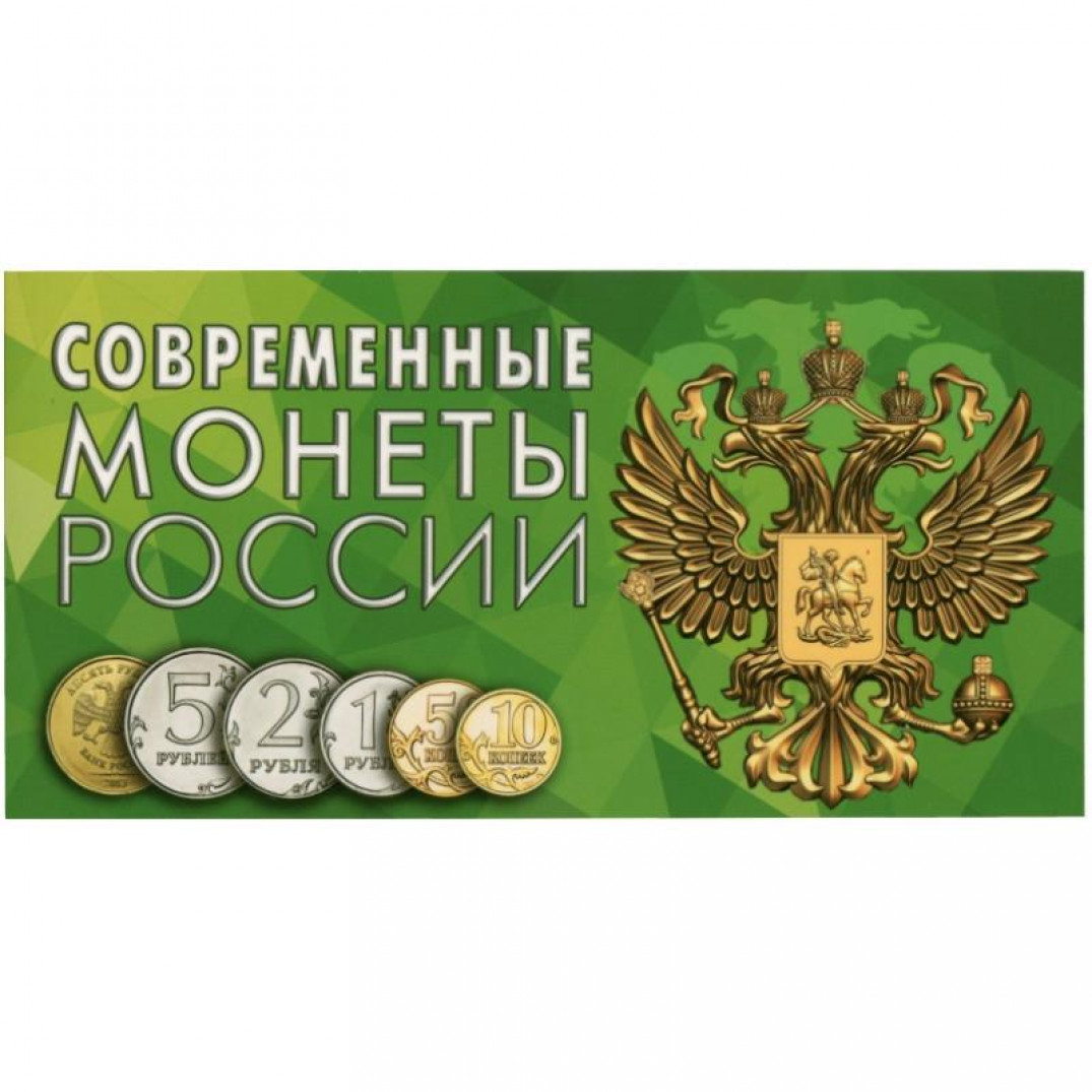 - Описание: Буклет под современные монеты России, на 8 монет, номиналом: 1, 5, 10, 50 копеек, 1, 2, 5, 10 рублей. Буклет для монет выполнен из ламинированного картона предназначен для небольших серий одной тематики. Размер ячейки соответствует размеру монеты, а каплевидная форма позволяет легко извлекать монеты из гнезда.