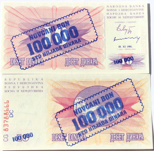 Банкнота 100000 динаров - Босния и Герцеговина, 1993 год, UNC