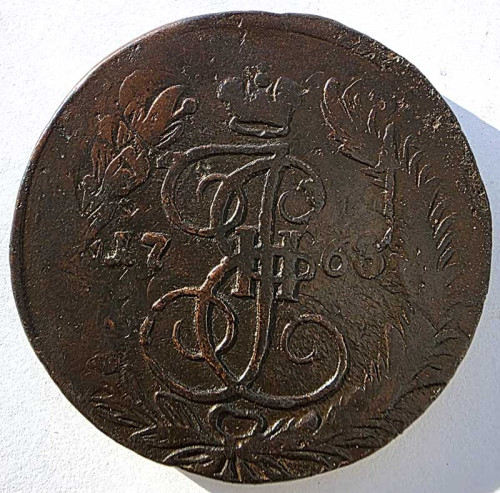 5 копеек 1763 год ЕМ, перечекан с 10 копеек барабаны