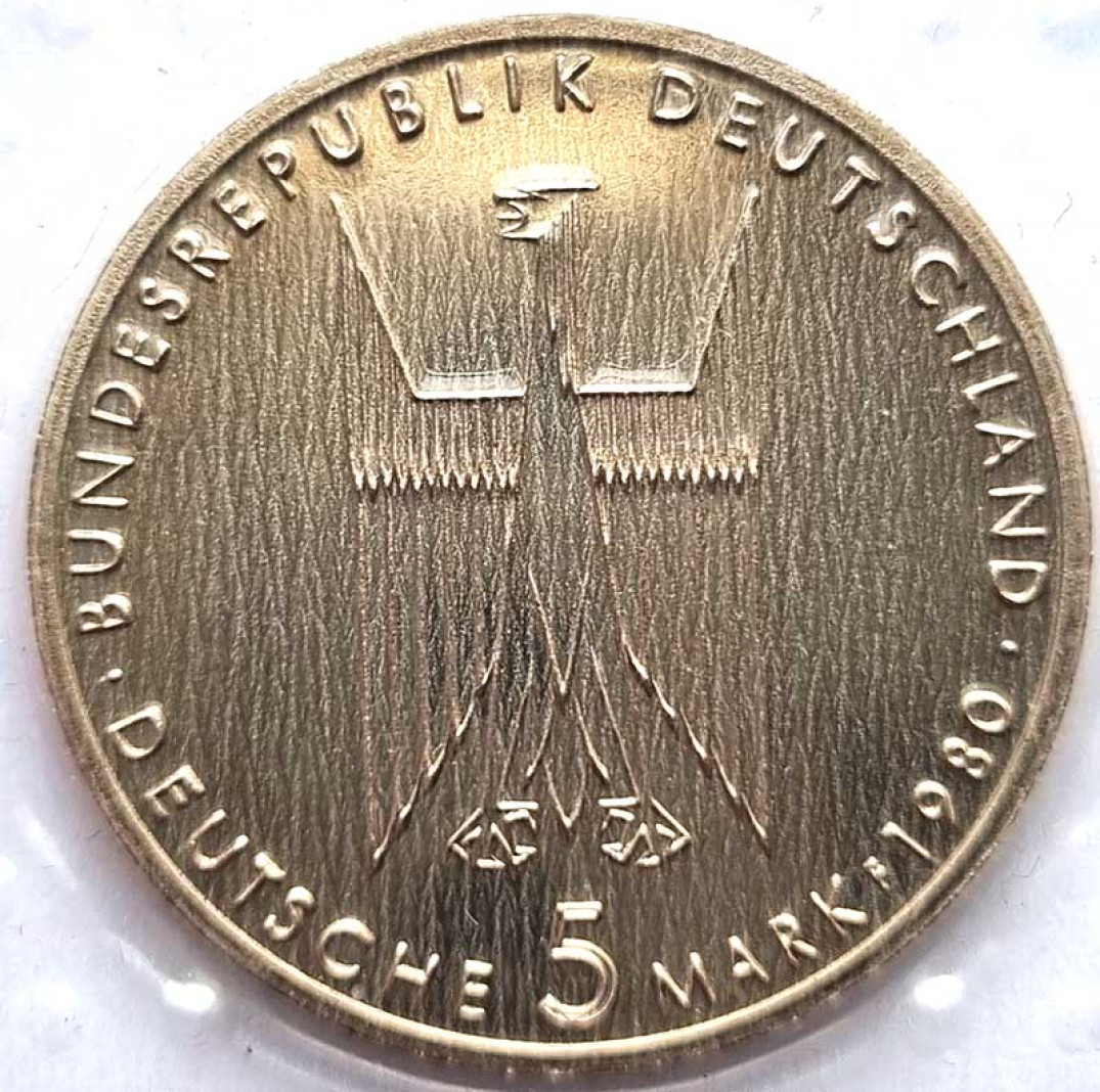 5 марок - 750 лет со дня смерти Вальтера фон дер Фогельвейде, Германия, 1980 год, в запайке
