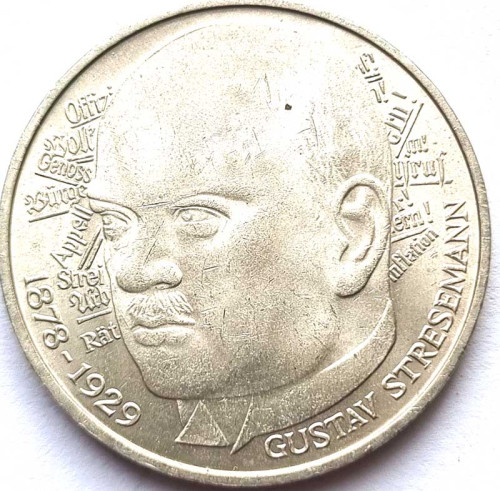 5 марок - 100 лет со дня рождения Густава Штреземана, Германия, 1978 год, серебро
