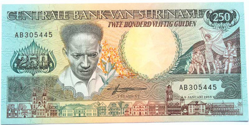 Банкнота 250 гульденов - Суринам, 1988 год, UNC