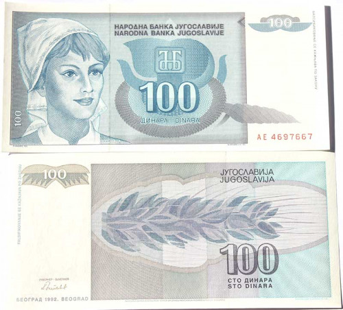 Банкнота - 100 динар - Югославия, 1992 год, UNC