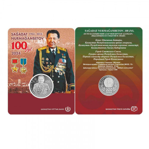 200 тенге - 100 лет со дня рождения Сагадата Нурмагамбетова, Казахстан, 2024 год, в блистере