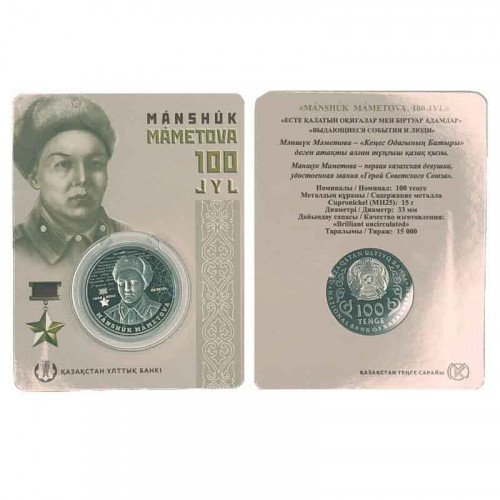 100 тенге - 100 лет со дня рождения Маншук Маметова, Казахстан, 2022 год, в блистере