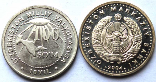 100 сумов - 10 лет национальной валюте Узбекистана, Узбекистан, 2004 год