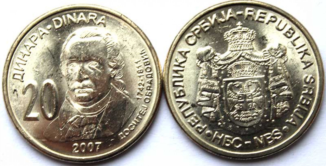 20 динар - 265 лет со дня рождения Доситея Обрадовича, Сербия, 2007 год