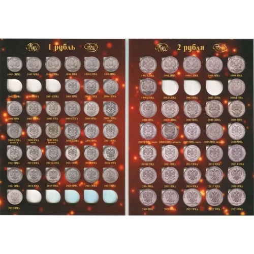 Набор 1 и 2 рубля 1997-2023 гг ( 66 монет в альбоме)