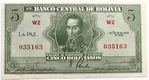 Банкнота 5 боливиано - Боливия, 1938 год, UNC
