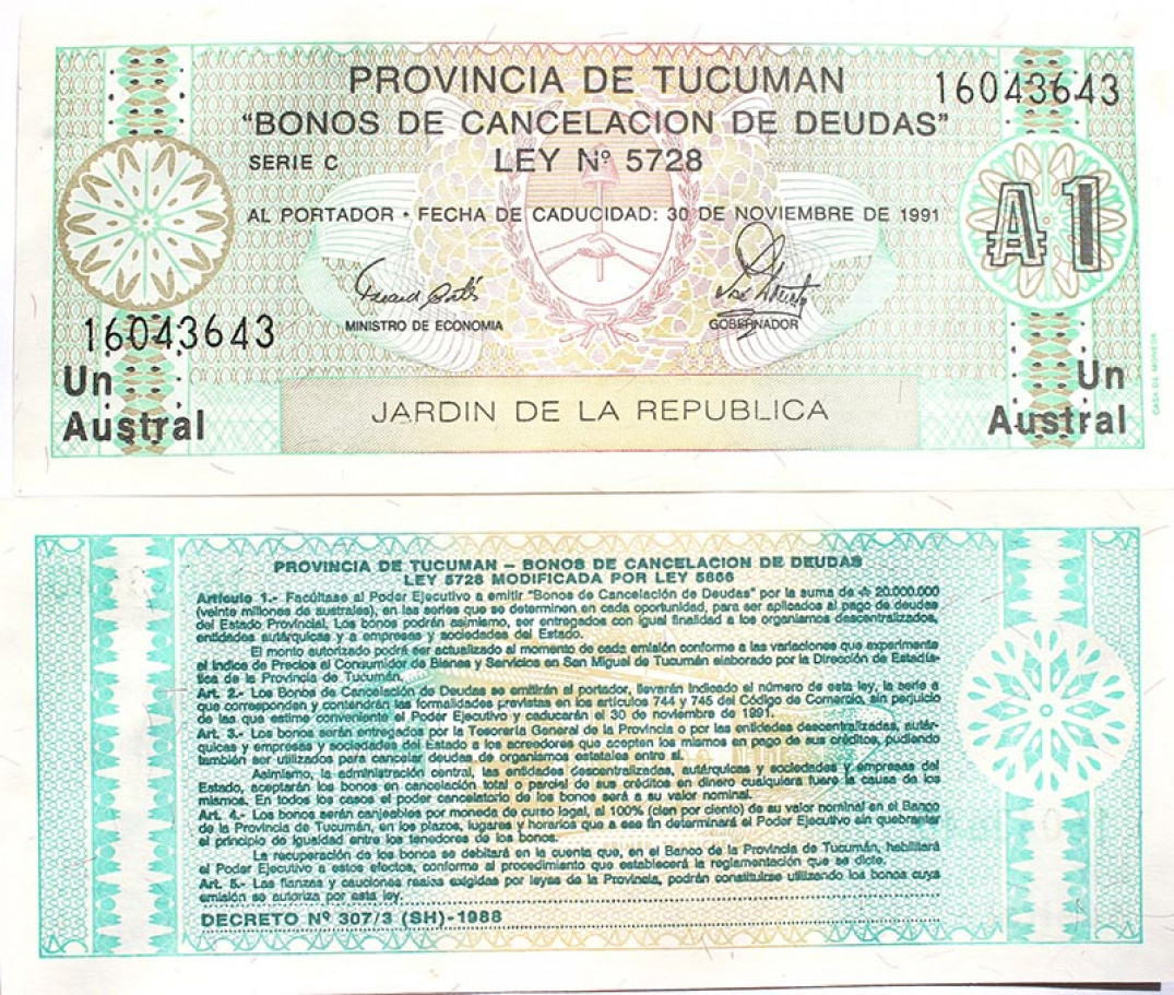 Банкнота 1 аустраль 1991 года - Тукуман, провинция Аргентины, UNC