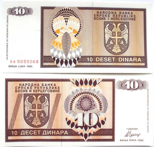 Банкнота 10 динаров - Босния и Герцеговина, 1992 год, UNC