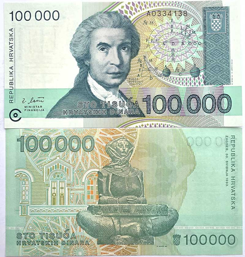 Банкнота 100000 динар - Хорватия, 1993 год, UNC