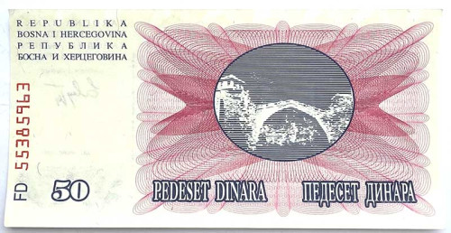 Банкнота 50 динар - Босния и Герцеговина, 1992 год, UNC