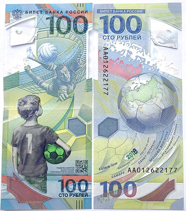 Банкнота 100 рублей - Чемпионат мира 2018 года, серия АА, из оборота