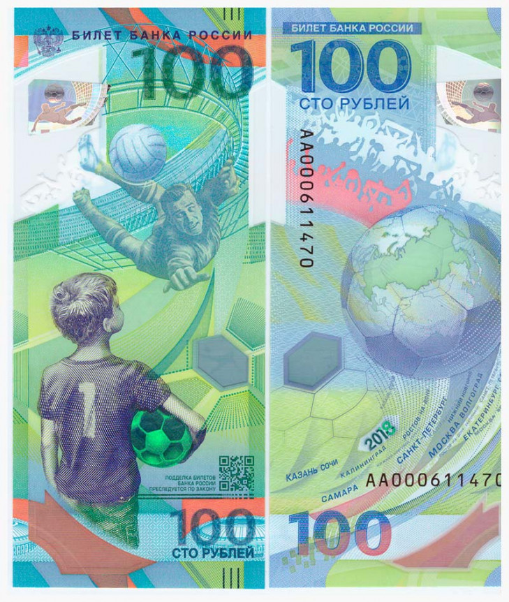 Банкнота 100 рублей - Чемпионат мира 2018 года, UNC, серия АА