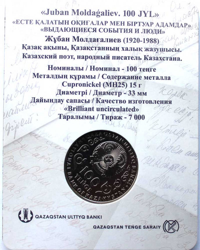 100 тенге - 100 лет со дня рождения Джубана Молдагалиева, Казахстан, 2020 год, в блистере