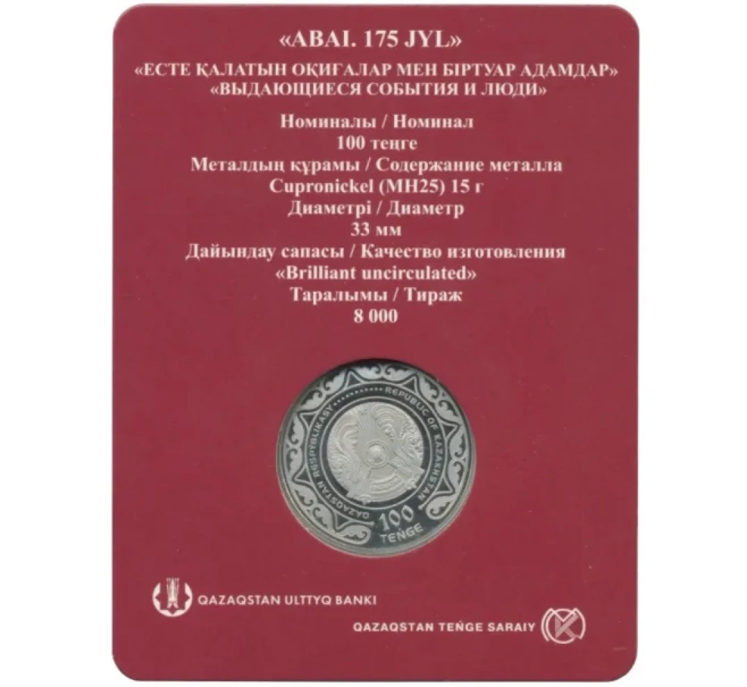 100 тенге - 175 лет со дня рождения Абая Кунанбаева, Казахстан, 2020 год, в буклете