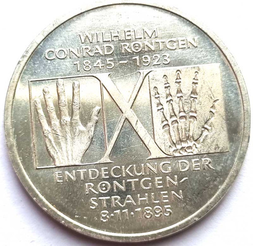 10 марок - 150 лет со дня рождения Вильгельма Конрада Рентгена, Германия, 1995 год, серебро