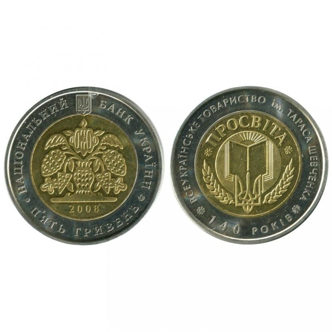 5 гривен - 140-летие Всеукраинского общества `Просвита` имени Тараса Шевченко, Украина, 2008 год (биметал)