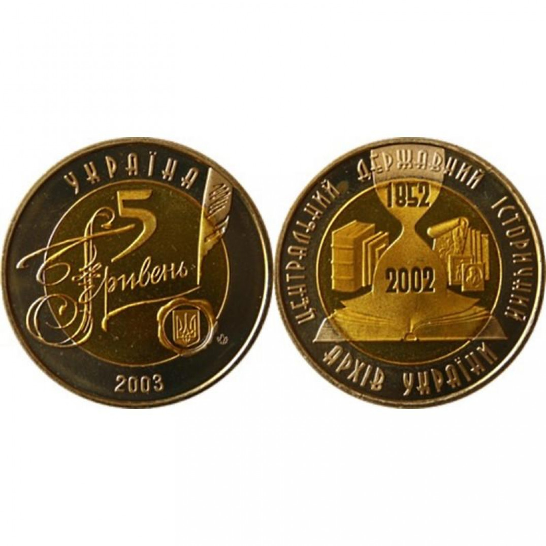 5 гривен - 150 лет Центральному государственному историческому архиву Украины, Украина, 2003 год (биметалл)