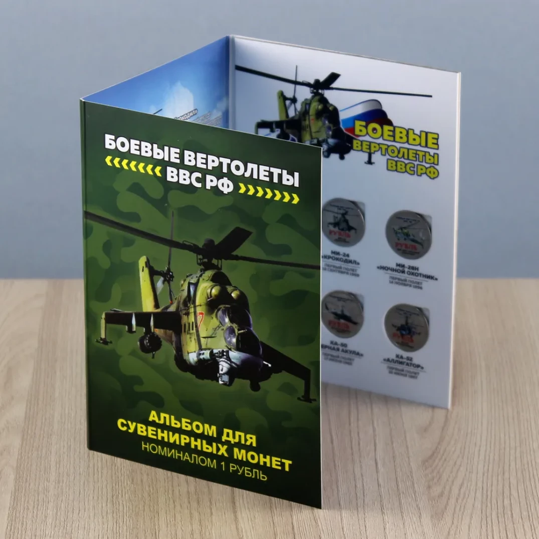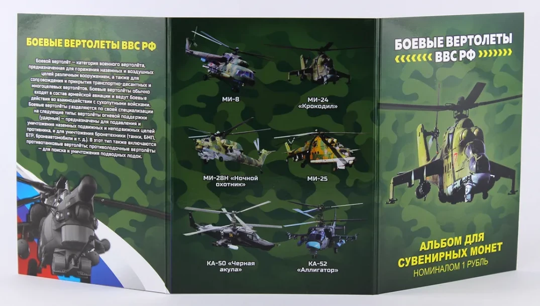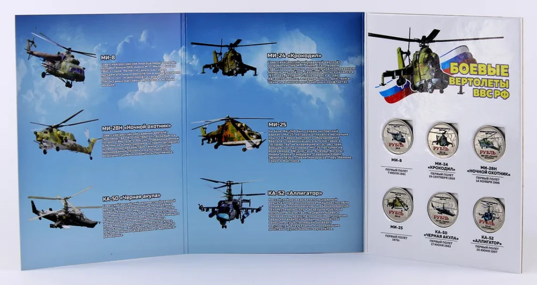 Набор монет - Боевые вертолеты ВВС РФ, (6 монет в коллекционном альбоме)
