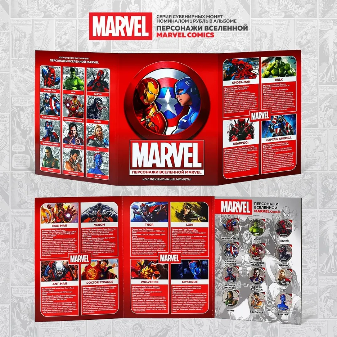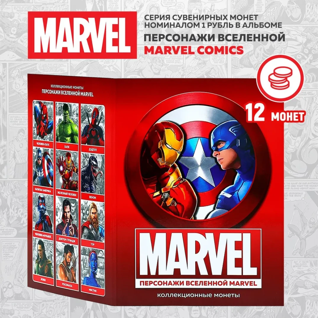 Набор монет - "Персонажи вселенной Marvel", (12 монет в альбоме)