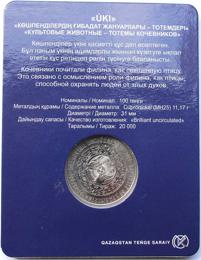 100 тенге -Культовые животные тотемы кочевников - Уки , Казахстан, 2019 год, в блистере