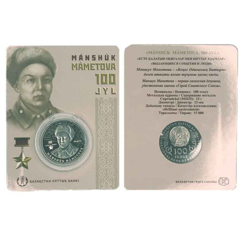 100 тенге - Маншук Маметова, Казахстан, 2022 год, в блистере