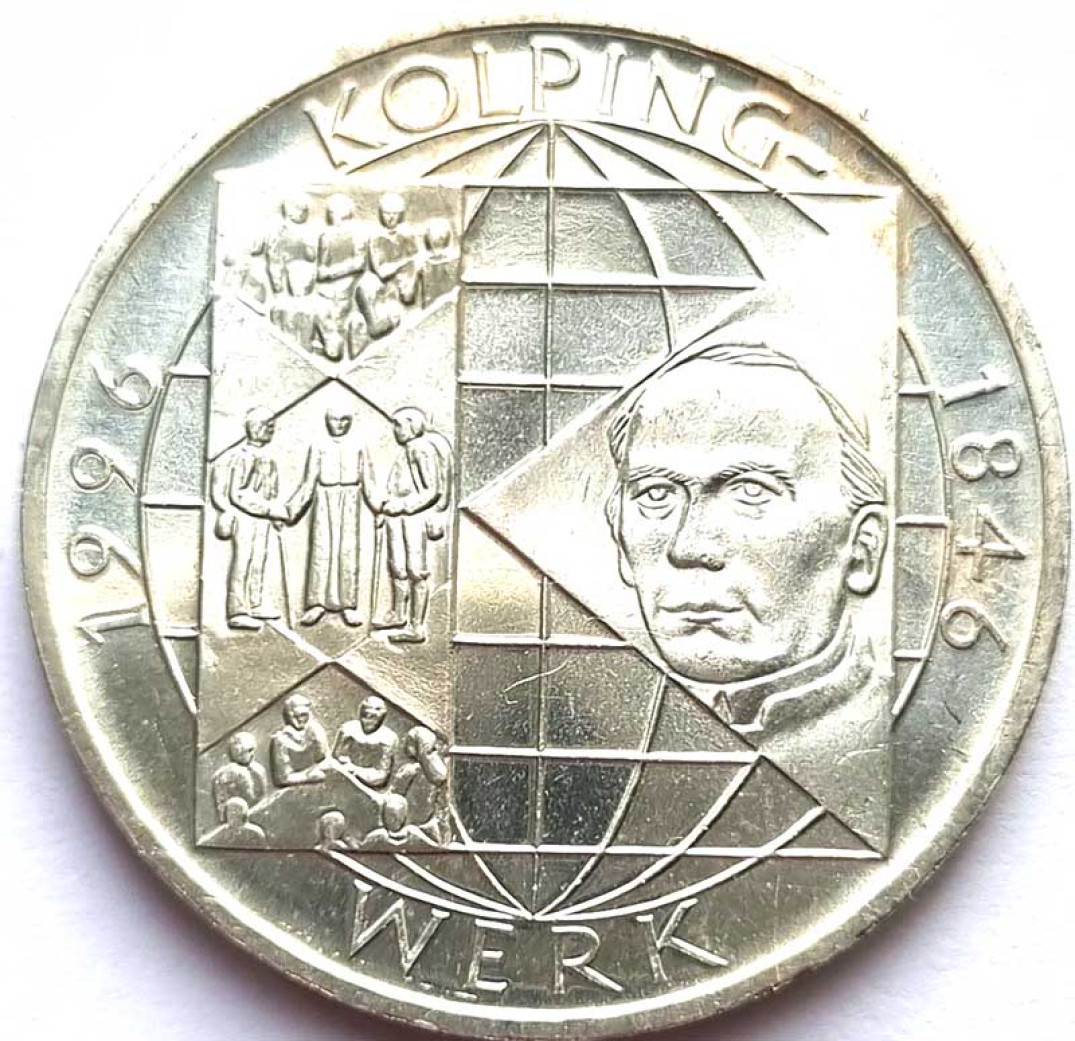 10 марок - 150 лет первой католической ассоциации ремесленников А. Колпинга, Германия, 1996 год, серебро